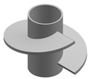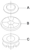 La parte estacionaria del anillo de tope (A) está asegurada en el tazón superior (cámara intermedia superior). La parte giratoria (B) está equipado por encima del colector [cono truncado (C)].